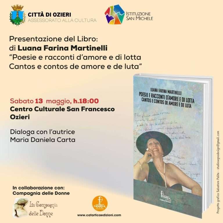 Sarà presentato sabato 13 maggio alle ore 18:00 al Centro Culturale di San Francesco di Ozieri, il libro “Poesie e racconti d’amore e di lotta – Cantos e contos de amore e de luta” di Luana Farina Martinelli.