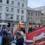 In piazza Garibaldi circa duecento persone: una bandiera della Palestina e tanti vessilli arcobaleno con la scritta Pace per chiedere la cessazione del conflitto.