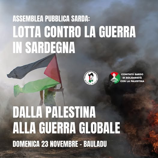 𝗗𝗼𝗺𝗲𝗻𝗶𝗰𝗮 𝟮𝟯 𝗻𝗼𝘃𝗲𝗺𝗯𝗿𝗲 𝗮𝗹𝗹𝗲 𝟭𝟬.𝟬𝟬 𝗮 𝗕𝗮𝘂𝗹𝗮𝗱𝘂, il Comitato sardo di Solidarietà per la Palestina e l’Associazione Amicizia Sardegna-Palestina hanno invitato 𝙞𝙡 𝙢𝙤𝙫𝙞𝙢𝙚𝙣𝙩𝙤 𝙨𝙖𝙧𝙙𝙤 𝙖 𝙧𝙞𝙪𝙣𝙞𝙧𝙨𝙞 𝙞𝙣 𝙖𝙨𝙨𝙚𝙢𝙗𝙡𝙚𝙖 per confrontarsi sulla riorganizzazione della lotta contro la guerra in Sardegna a partire da una mobilitazione per la chiusura della fabbrica Rwm.