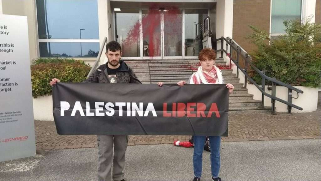 Questa sera, 4 persone aderenti alle campagne di Palestina Libera e Ultima Generazione hanno compiuto un’azione di disobbedienza civile nonviolenta, lanciando vernice lavabile color sangue contro una sede Leonardo a Brescia, ed esponendo uno striscione con scritto “Palestina Libera”. Ultima Generazione ha partecipato a questa azione chiedendo che i soldi devoluti alle armi possano invece essere investiti in un fondo riparazione in supporto ai cittadini italiani in caso di disastri naturali. La campagna Palestina Libera è il ramo italiano della campagna Palestine Action che, con le azioni dirette in Inghilterra ha portato alla chiusura di tre fabbriche di armi della Elbit System, un’azienda israeliana attiva nello sviluppo di armamenti