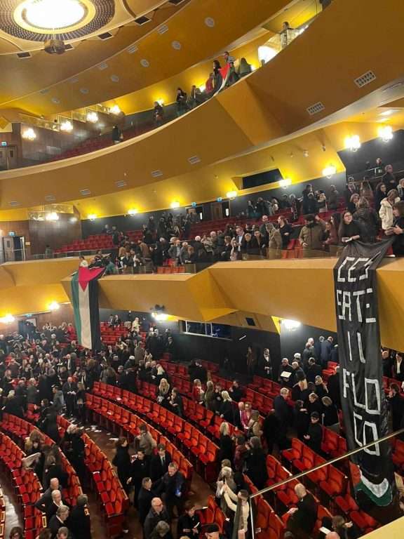 Era appena andata in scena la Tosca, diretta da Beatrice Venezi, quando la platea e le logge si sono riempite di bandiere palestinesi e volantini contro il genocidio in atto a Gaza.