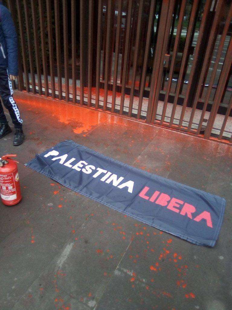 Questa mattina alle ore 11.00 due attivisti aderenti alla campagna “Palestina Libera”, hanno colpito con vernice rossa la sede della Leonardo s.p.a. usando un estintore. I due attivisti hanno poi esposto uno striscione con scritto “Palestina Libera”. Alle 11.35 sono arrivate le forze dell’ordine che hanno portato via gli attivisti.