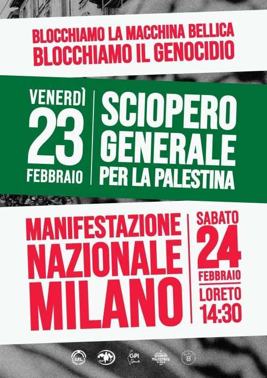 È stato indetto per venerdì 23 febbraio uno sciopero generale nazionale per chiedere di ‘fermare il genocidio’ in corso a Gaza.