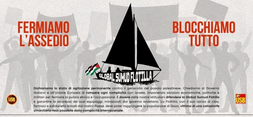 Per queste ragioni annunciamo sin da ora lo stato di agitazione per tutti i settori del lavoro privato e la messa in campo di azioni di protesta, a tutela e sostegno della Global Sumud Flottilla e del suo carico di solidarietà internazionalista.