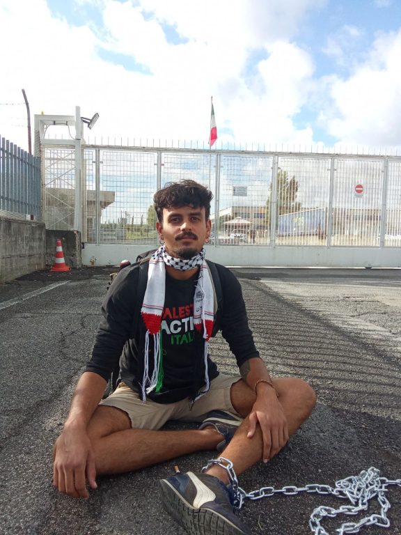 Dopo essersi legato di fronte al cancello Angelo dichiarerà: “Fermare un crimine di guerra, è un nostro dovere. Come cittadini italiani siamo complici e dobbiamo fermare questo Genocidio”