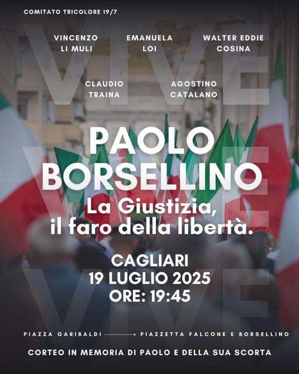 Sabato 19 luglio a Cagliari, in piazza Garibaldi, avrà inizio la manifestazione “Paolo Borsellino, la Giustizia il faro della libertà” per commemorare Paolo Borsellino e gli Agenti della scorta vittime di mafia promossa dal “Comitato tricolore 19 luglio”, con la quale si intende onorare la loro memoria.