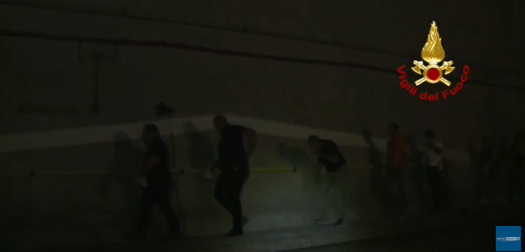 L’esercitazione ha previsto la simulazione di un intervento per il soccorso ad un treno viaggiatori in fiamme all’interno della galleria, con persone intossicate e un ustionato.