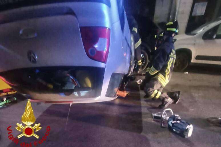 Dopo una sbandata l’utilitaria è finita sulle macchine in sosta ribaltandosi.