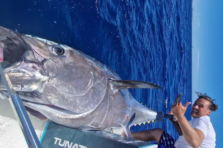 “Ero in compagnia di due ospiti, padre e figlio in vacanza in Gallura, che oggi avevano prenotato l’esperienza di pesca con la mia associazione dilettantistica ‘A pesca col matto’ – racconta all’ANSA Giovannini – Stavamo facendo pesca a traino con esche vive, quando per tre volte questo tonno ci ha sbobinato il mulinello. Abbiamo dovuto combattere un po’ per riuscire a prenderlo. Avevo intuito che si trattava di un grosso esemplare, ma mai avrei pensato che potesse avere queste dimensioni. Sono quasi sicuro si tratti di uno tra i tonni rossi più grandi mai pescati in queste acque”.
