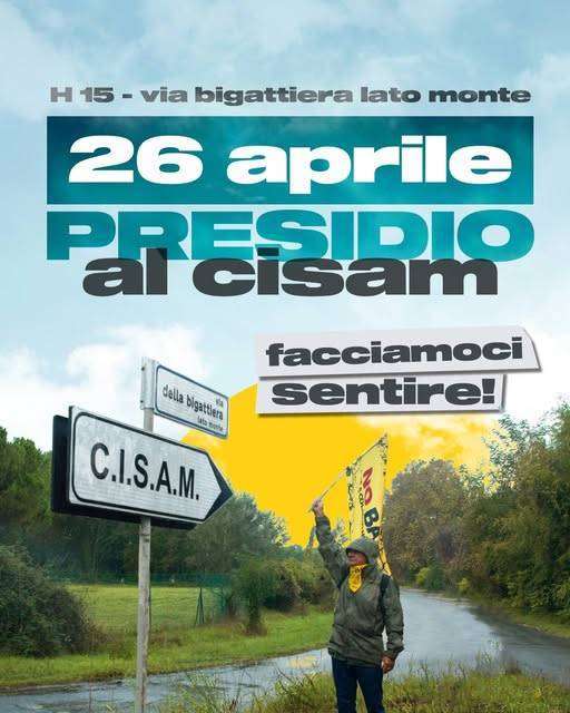 “Il 26 aprile sarà un grande Presidio popolare e territoriale di fronte ai cancelli del CISAM, per puntare i riflettori sul nuovo progetto di base militare e levare una voce molteplice, forte e comune contro questo progetto e contro guerra, riarmo, devastazione ambientale e spese militari.