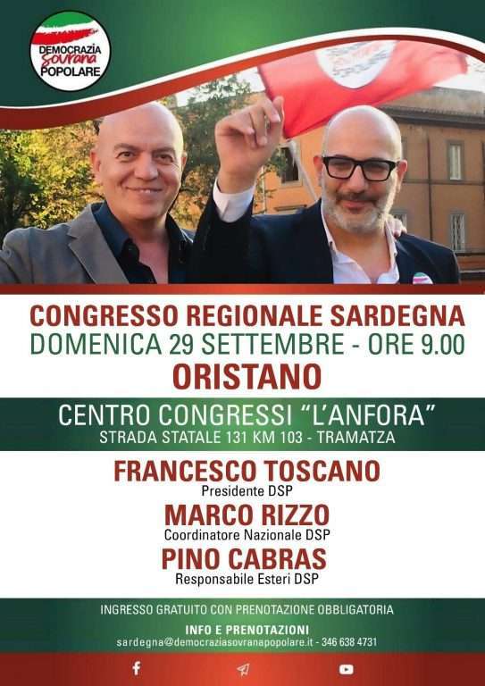 Il 29 settembre si svolgerà presso il Centro Congressi L’Anfora a Tramatza (SS 131 km 103). il primo Congresso Regionale di Democrazia Sovrana e Popolare.