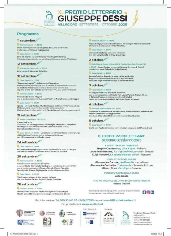 È l’edizione della maturità quella che celebra, a Villacidro, il quarantennale del Premio Letterario Giuseppe Dessì, che si concluderà il 4 ottobre con la premiazione dei vincitori, dopo un’intensa stagione di eventi culturali – spettacoli, concerti, presentazioni editoriali, incontri con gli autori e rappresentazioni teatrali – che proseguiranno fino alla cerimonia finale e anche nei giorni successivi.