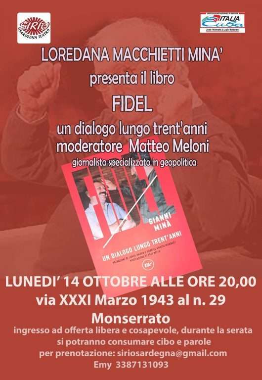 Il libro “Fidel. Un dialogo lungo trent’anni” verrà presentato a Monserrato il prossimo lunedì 14 ottobre in via XXXI marzo 1943 a partire dalle ore 20.