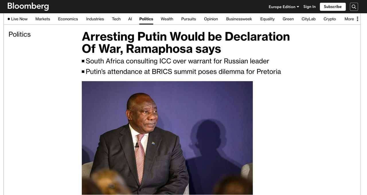 Presidente Sudafrica: “L’ipotetico arresto del presidente Putin in Sudafrica su mandato della Corte penale internazionale equivarrebbe a una dichiarazione di guerra”
