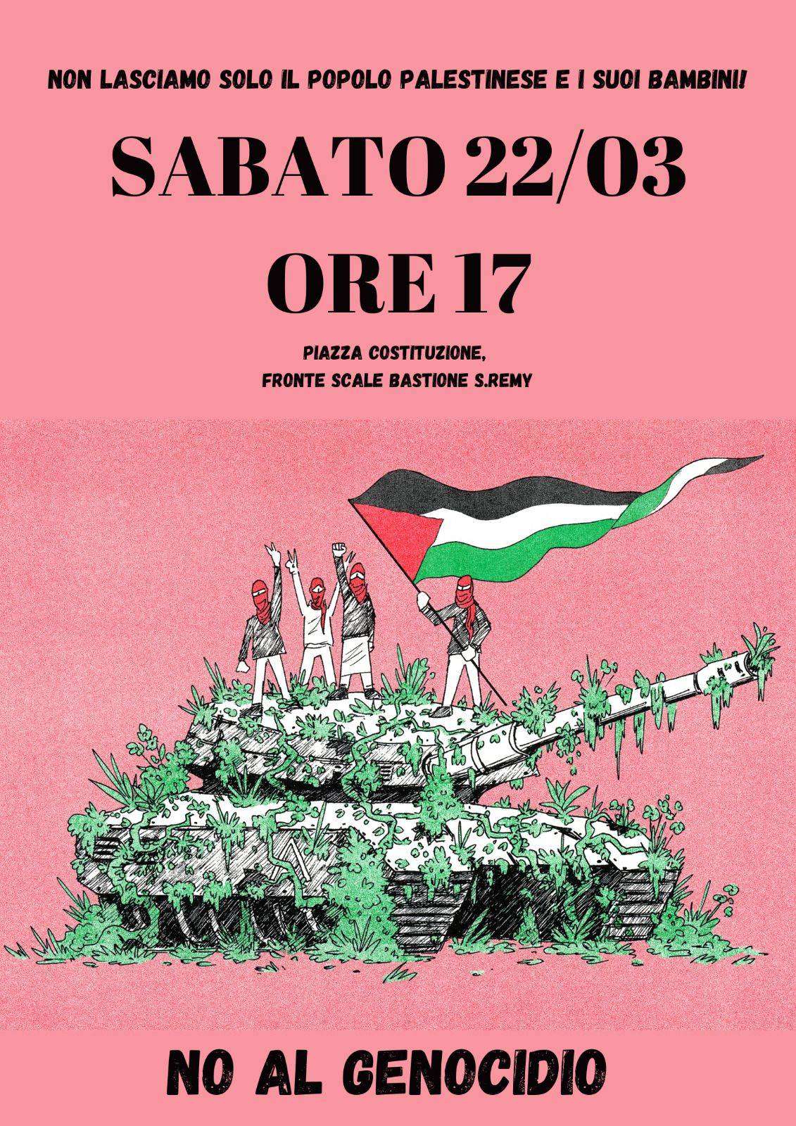 La Corte Internazionale di Giustizia lancia una coalizione globale (Global 195) per perseguire i criminali di guerra israeliani cercando le responsabilità attraverso l’intera catena di comando militare e politica, mentre il governo italiano persevera con la propria complicità nell’oppressione del popolo palestinese e nella repressione della sua resistenza, continuando a fornire appoggio politico, militare, economico e ideologico al terrorismo organizzato israeliano, incarcerando un partigiano palestinese, Anan Yaeesh e processandolo con altri 2 cittadini palestinesi”, per queste ragioni è stato promosso per sabato 22 Marzo dalle ore 17 un presidio e corteo da p.zza Costituzione.