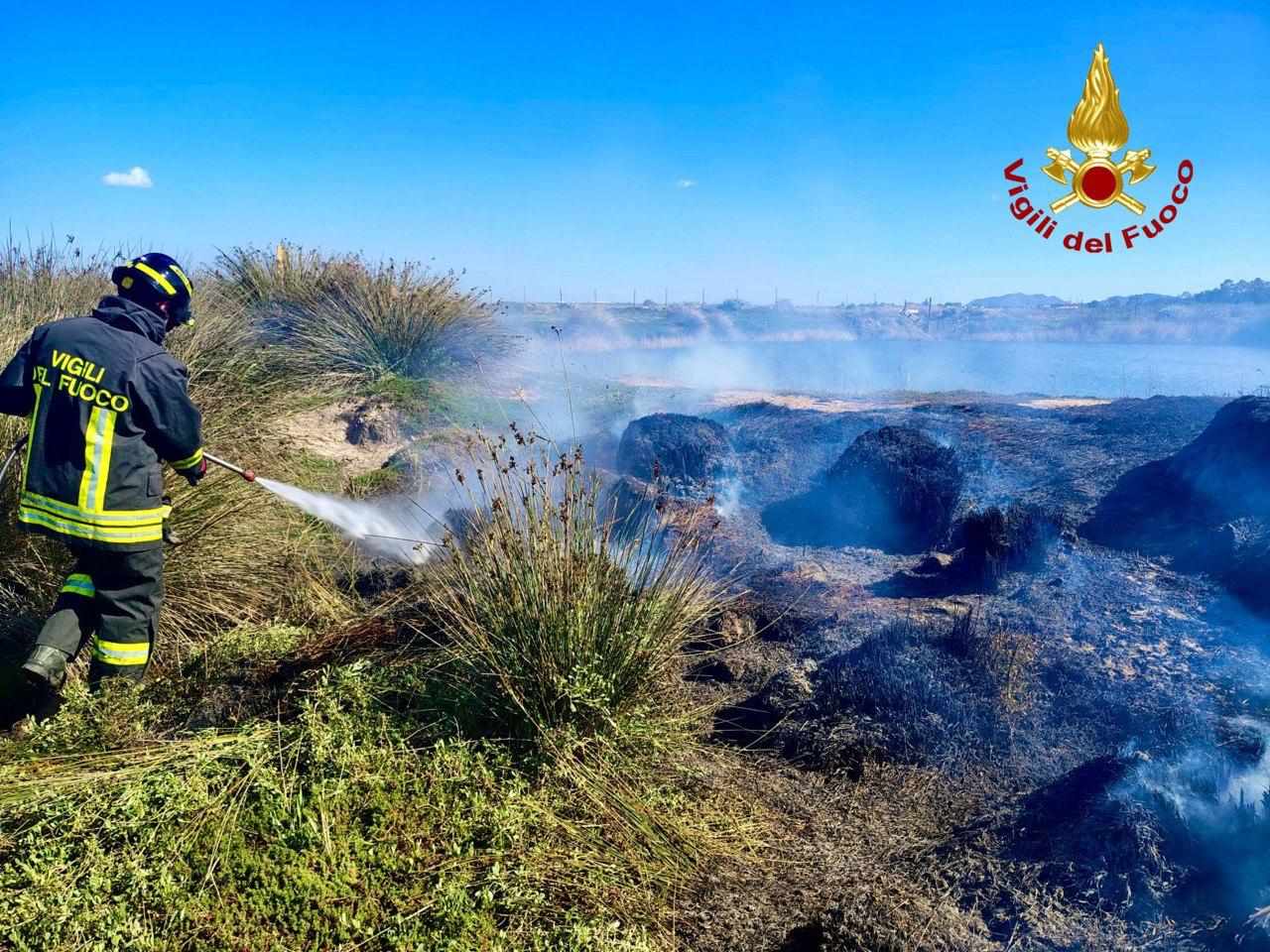 Intervento dei Vigili del Fuoco di Cagliari a Capoterra, in località Pisighittu, per un incendio che ha coinvolto una vasta area di vegetazione e sterpi.