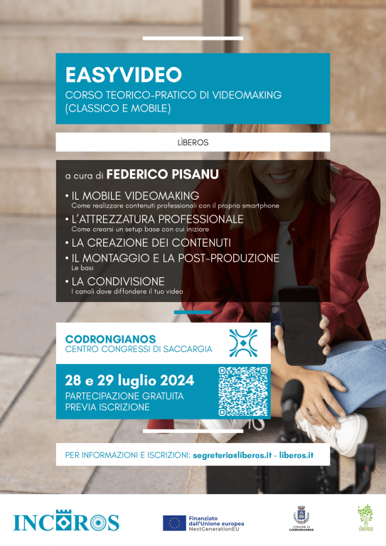 Il Comune di Codrongianos organizza, in collaborazione con Lìberos, il corso teorico-pratico di videomaking “EasyVideo” con Federico Pisanu, videomaker professionista. Gli argomenti del corso spazieranno dal mobile videomaking alla descrizione dell’attrezzatura professionale, dalla creazione di contenuti al montaggio e alla post-produzione, con uno sguardo ai canali più adatti alla condivisione dei propri lavori.