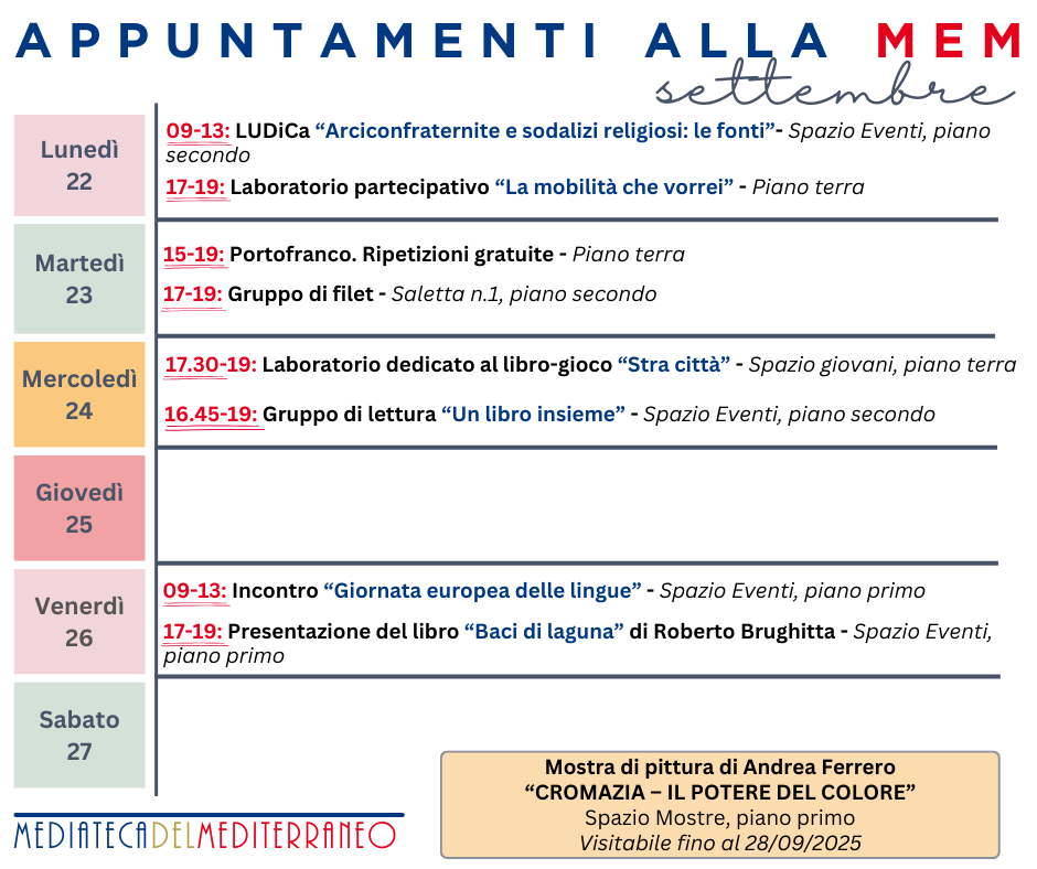 La MEM – Mediateca del Mediterraneo di Cagliari rinnova il suo impegno nell’offrire un calendario di eventi culturali, educativi e sociali per la settimana dal 22 al 28 settembre 2025. Situata in via Mameli n. 164, la Mediateca si conferma come punto di riferimento per la promozione della cultura e della storia del Mediterraneo e della Sardegna.