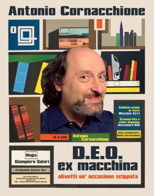 “D.E.O. ex Macchina / Olivetti, un’occasione scippata” è un originale e coinvolgente monologo che rievoca un’epoca particolarmente feconda di crescita economica e sviluppo industriale nell’Italia del secondo dopoguerra: Antonio Cornacchione nelle sue “memorie di un impiegato” porta in scena il talento manageriale e la capacità imprenditoriale di Andriano Olivetti che sulle orme del padre, punta sull’innovazione tecnologica e proietta idealmente l’azienda di famiglia nel futuro. “D.E.O. ex Macchina” – con un titolo che rimanda per assonanza al Deus ex Machina delle antiche tragedie, ma prende spunto dall’acronimo della Divisione Elettronica Olivetti (DEO) per reinventare la locuzione latina – ricostruisce una vicenda emblematica in cui una dinastia imprenditoriale capace di coniugare la ricerca con l’applicazione pratica e sfruttare se non anticipare le potenzialità del mercato, dopo la scomparsa del brillante e carismatico primogenito, in crisi di liquidità, scegliendo la prudenza e riducendo gli investimenti, rinuncia a uno dei rami più promettenti della sua attività, consegnando di fatto il proprio comparto informatico alla concorrenza statunitense.