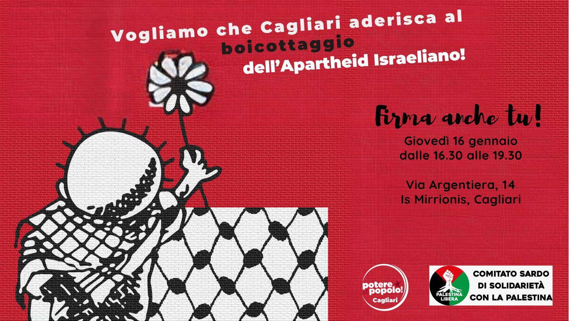 Giovedì 16 gennaio continua la raccolta firme per la petizione popolare che chiede al Comune di Cagliari di aderire fattivamente al boicottaggio di aziende e istituzioni israeliane coinvolte nella violazione dei diritti umani nella Palestina occupata e che promuoviamo come Potere al Popolo Cagliari e Comitato Sardo di Solidarietà con la Palestina.