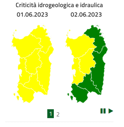 codice giallo (criticità ordinaria) per idrogeologico per temporali sulle aree di allerta Iglesiente, Campidano, Montevecchio Pischinappiu e Tirso, Flumendosa Flumineddu, Gallura e Logudoro.