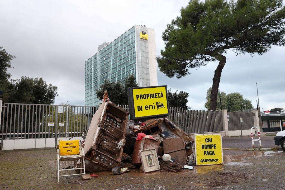 Questa mattina la protesta degli attivisti di fronte alla sede dell’Eni a Roma con un grande cumulo di oggetti distrutti dalle recenti alluvioni avvenute in Emilia-Romagna e nello stato del Rio Grande do Sul (Brasile), ed il messaggio “Chi rompe paga”.