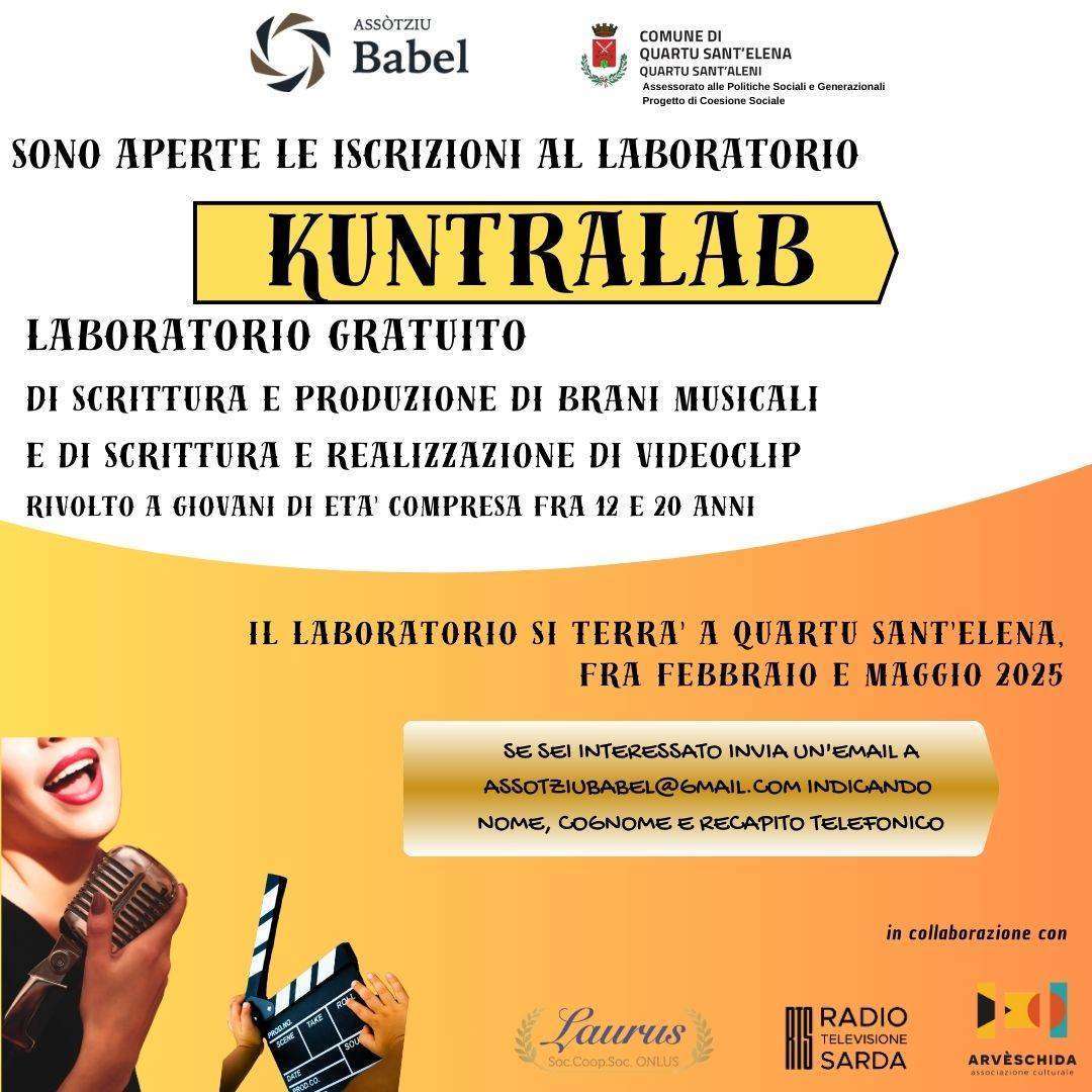 L’associazione Culturale Babel prosegue il percorso avviato negli scorsi anni per il coinvolgimento e la formazione dei giovani tra i 12 e i 20 anni nell’ambito della scrittura, della musica e della trasposizione in videoclip. ‘Kuntralab’ è finanziato dal Comune di Quartu Sant’Elena nell’ambito dei progetti di Coesione Sociale, con la supervisione dell’Assessorato ai Servizi Sociali e alle Politiche Generazionali.