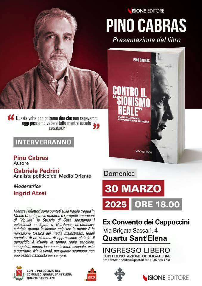 Domenica 30 marzo, a Quartu Sant’Elena (CA) si svolgerà la presentazione di “Contro il Sionismo Reale” (Visione Editore). A dialogare con l’autore Pino Cabras ci sarà Gabriele Pedrini, analista politico del Medio Oriente, con la moderazione di Ingrid Atzei.
