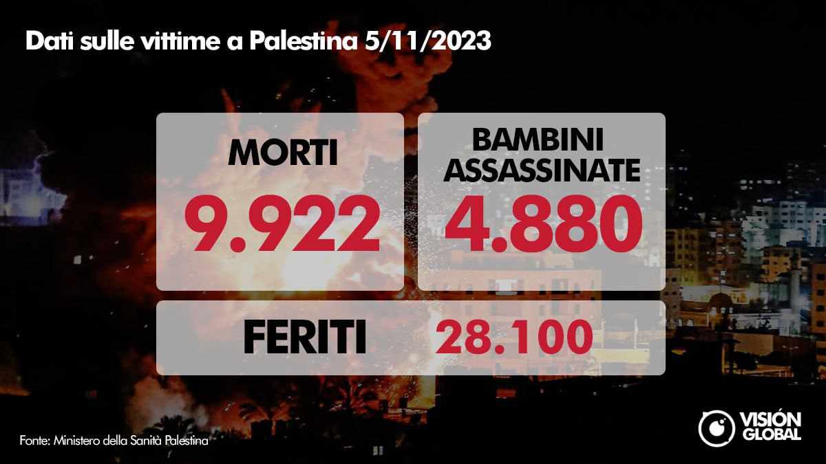Il Ministero della Sanità palestinese ha appena riferito che il bilancio delle vittime nell’enclave assediata e Cisgiordania è salito a 9.922, compresi 4.880 bambini, dal 7 ottobre. In Israele sono morte 1.405 persone e ferite 5.600.