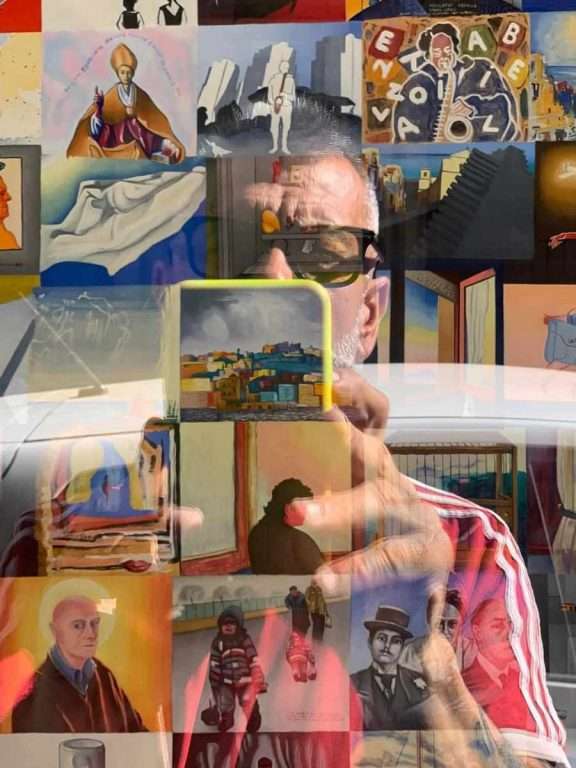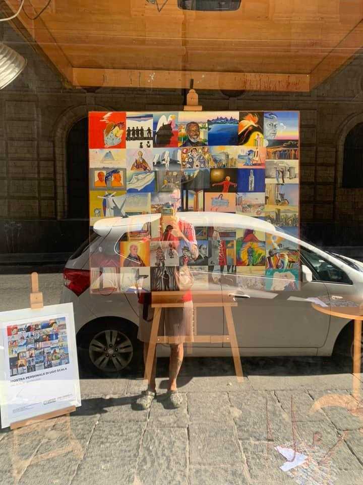 Come sempre da Gino Ramaglia, storico rivenditore d’articoli per Belle Arti, la vetrina è uno strumento di relazione e connessione transgenerazionale, uno strumento che preserva la memoria e la registra verso il futuro, in quest’ottica Ugo Scala, storico artista che vive e lavora tra Roma e Sorrento, presenta un lavoro che apre dei file di rappresentazione iconica e simbolica, dove le immagini simboliche sono direttamente connesse al libro “Napoli nessuna e centomila nei racconti di cinquanta scrittori”, testo edito da “La Repubblica” nel 2021, curato da O.Ragone e C.Sannino, il lavoro in vetrina si presenta come unico, in realtà è concepito come fosse un colto desktop digitale, che associa a ogni immagine un racconto, la caffettiera napoletana di un tempo e direttamente connessa al racconto “La verità è immaginazione” di Sandro Veronesi, in altre parole in un’unica tela convivono cinquanta lavori visivi che illustrano un testo narrato collettivo che focalizza Napoli, una meravigliosa operazione di custodia della memoria.