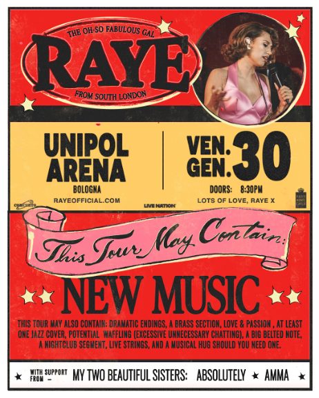 In concomitanza con la pubblicazione del nuovo singolo, RAYE annuncia il tour mondiale “THIS TOUR MAY CONTAIN NEW MUSIC”, una tournée di 40 date che partirà il 22 gennaio e si concluderà il 12 maggio 2026, toccando le arene più importanti d’Europa, UK e Nord America. Il tour vedrà come opening act le sorelle di RAYE, ABSOLUTELY e AMMA, che porteranno sul palco un’anteprima della straordinaria energia familiare che accompagnerà ogni show.