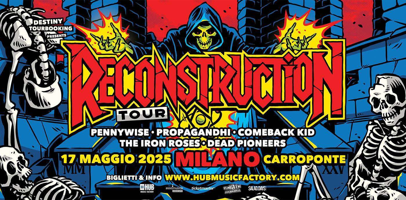 Il Reconstruction Tour è un festival che nasce dal leggendario Deconstruction Tour che ha segnato la storia del punk rock nei primi anni 2000. Arriva per la prima volta in Italia il 17 maggio 2025 al Carroponte di Sesto San Giovanni con una line-up d’eccezione: Pennywise, Propagandhi, Comeback Kid, The Iron Roses e Dead Pioneers.
