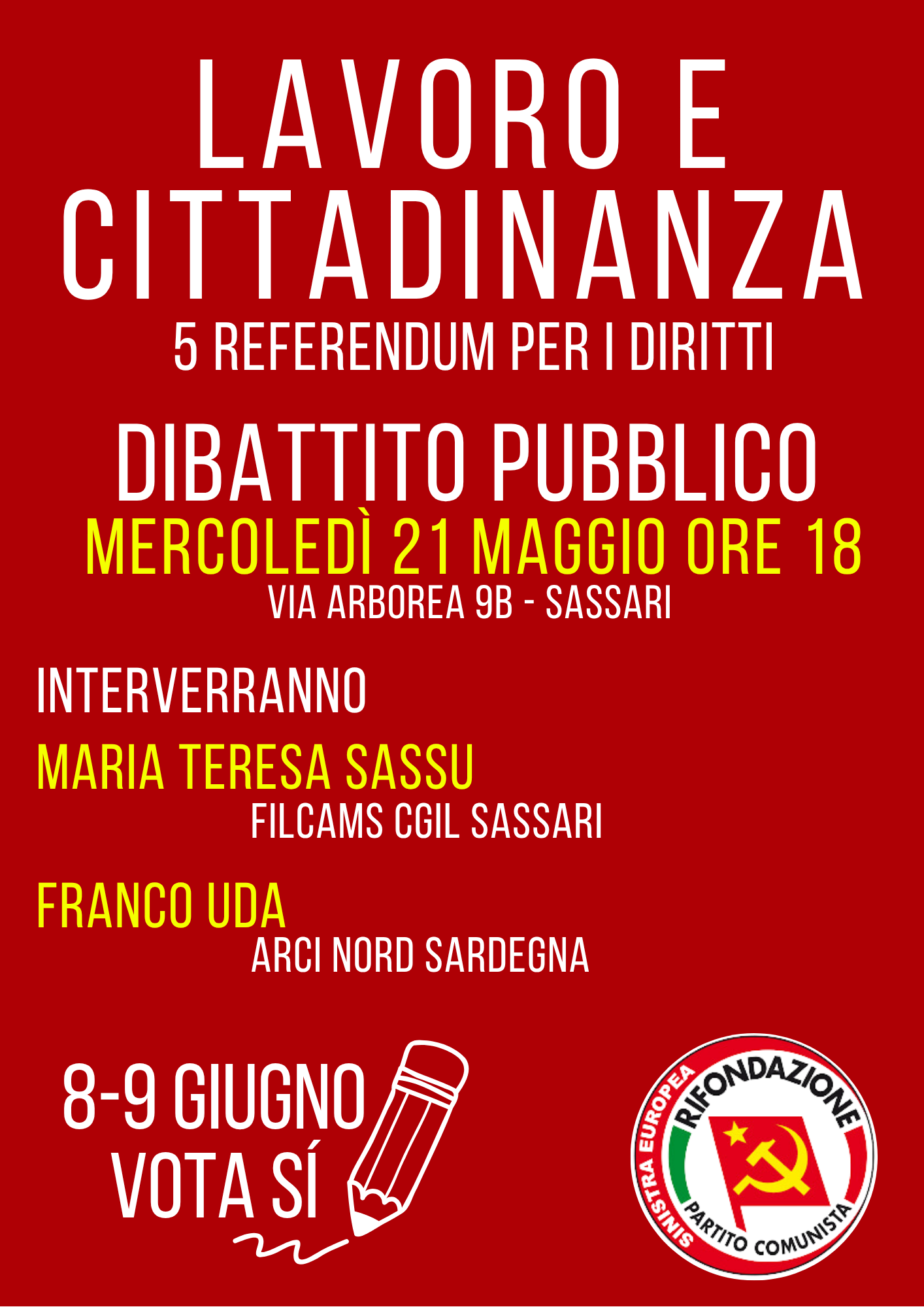 Mercoledì 21 maggio alle ore 18, presso la sede del Partito della Rifondazione Comunista in via Arborea 9/B a Sassari, si terrà un incontro pubblico per discutere dei cinque referendum in programma l’8 e il 9 giugno.