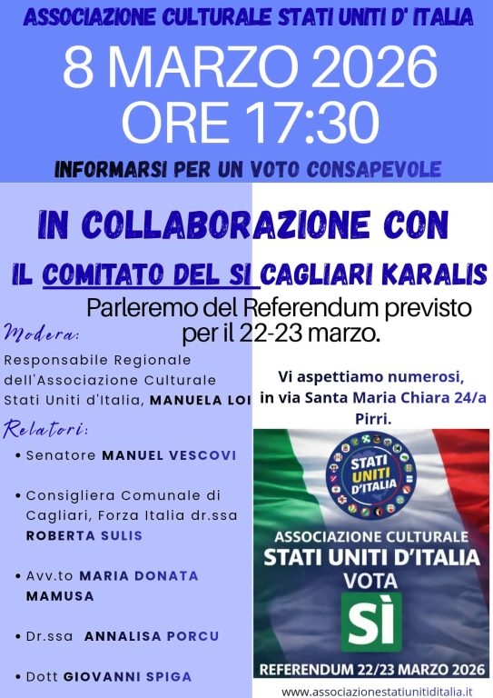 L’ Associazione Culturale Stati Uniti d’Italia ha promosso per domenica 8 marzo alle 17:30, un incontro insieme al Comitato del SI alla presenza di numerosi relatori.