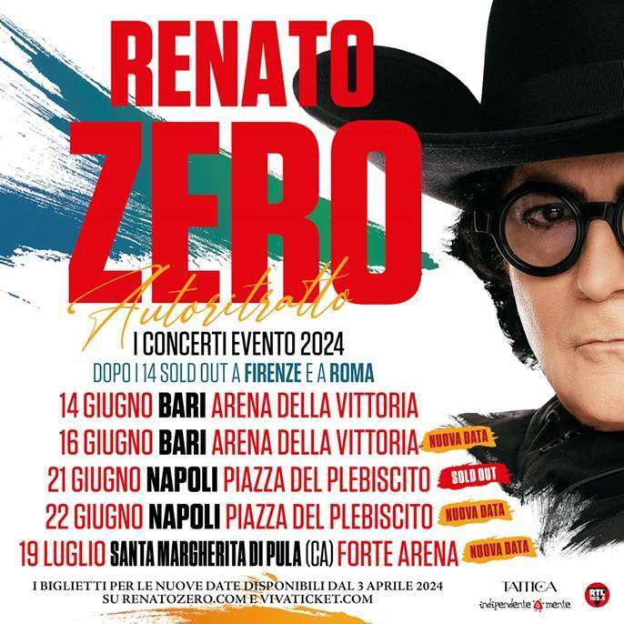 Si sono da poco conclusi i 14 appuntamenti dal vivo nei palazzetti di Roma e Firenze di Renato Zero: un successo di grandi proporzioni che è stato accompagnato anche dall’annuncio di un tour estivo. Alle date all’Arena della Vittoria di Bari del 14 giugno, quasi sold out, e quella in Piazza Plebiscito a Napoli del 21, già tutta esaurita, si aggiungono ben tre nuovi show di Autoritratto.