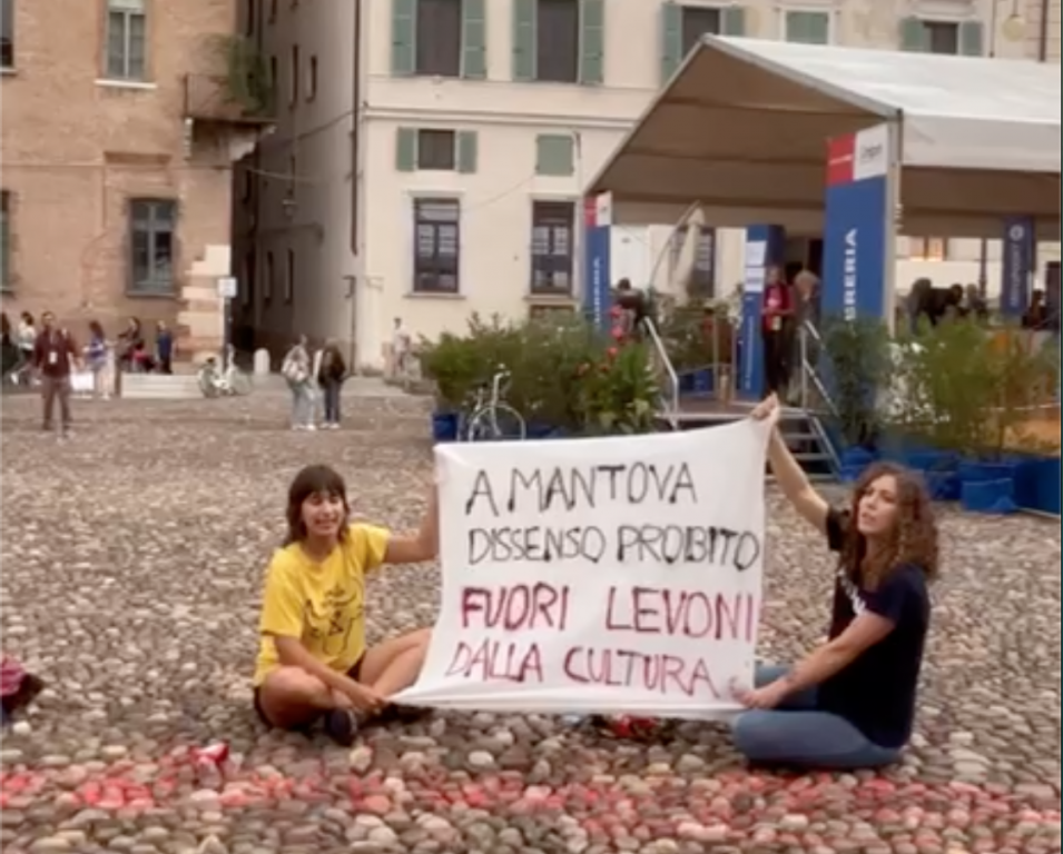 Nel pomeriggio di domenica 8 settembre un gruppo di attiviste antispeciste del movimento Ribellione Animale ha contestato Festivaletteratura, una delle più importanti manifestazioni culturali della penisola. Le attiviste hanno tracciato una linea di separazione di vernice rossa tra la libreria del Festival e lo stand di salumi dell’azienda Levoni, posti nella piazza principale della città, una di fronte all’altro. L’azione vuole porre una netta divisione tra la cultura e lo sfruttamento degli animali, due ambiti incompatibili che non dovrebbero coesistere. Le attiviste si sono incollate al selciato esponendo uno striscione con la scritta “A Mantova dissenso proibito. Fuori Levoni dalla cultura”.