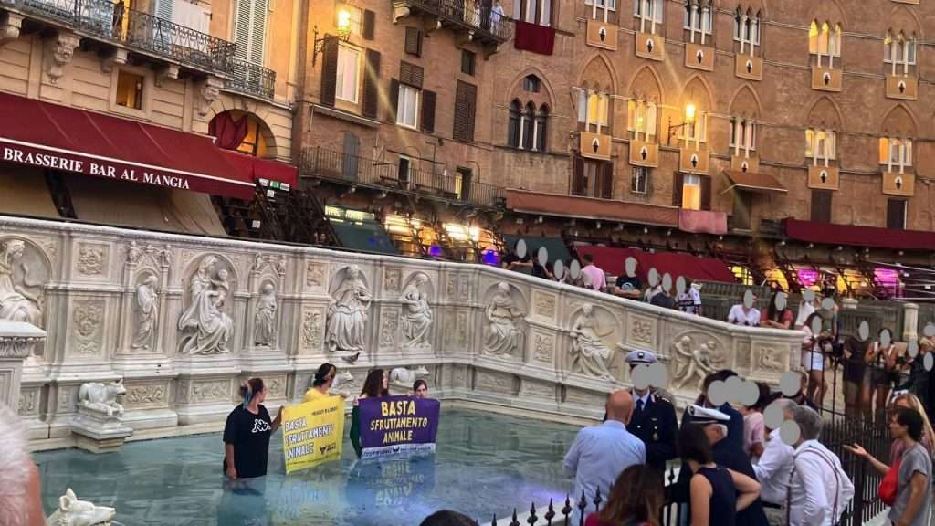 Nella giornata del palio di Siena, venerdì 16 agosto, un gruppo di attiviste del movimento antispecista Ribellione Animale ha tinto di nero l’acqua della Fonte Gaia, in segno di lutto, per tutti i cavalli morti negli anni durante il palio o a causa di questa ricorrenza. Rimaste per più di un’ora dentro la vasca monumentale di Piazza del Campo, le attiviste hanno letto i nomi di tutti cavalli morti per ricordarli. Con quest’azione diretta, dopo anni di ostruzionismo da parte della Questura per manifestazioni preavvisate, si vuole denunciare in modo dirompente non la ricorrenza in sé, ma lo sfruttamento animale da cui ancora non si è emancipata. Sugli striscioni infatti si legge: “Basta sfruttamento animale”.