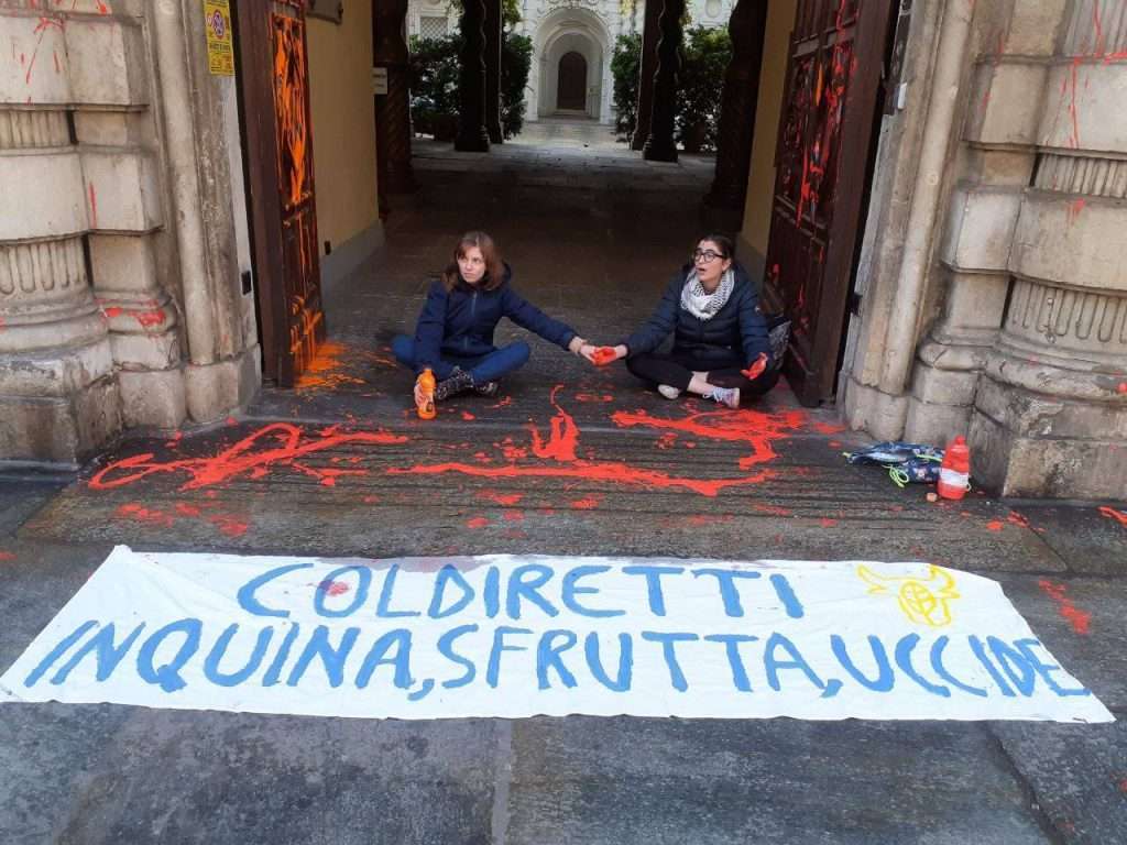 Nella mattina di lunedì 11 dicembre, tre attiviste di Ribellione Animale, con un’azione di disobbedienza civile nonviolenta, hanno imbrattato l’ingresso della Federazione Regionale Coldiretti Piemonte. Le attiviste hanno steso uno striscione e si sono incollate per ostruire il normale accesso all’edificio. Nei loro discorsi e sullo striscione la denuncia: “Coldiretti inquina, sfrutta, uccide”.
