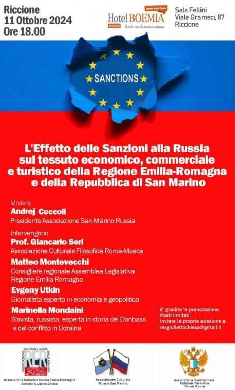 Si svolgerà l’11 ottobre a Riccione presso l’Hotel Boemia con convegno dal titolo: “L’effetto delle sanzioni alla Russia sul tessuto economico, commerciale e turistico della Regione Emlia Romagna e della Repubblica di San Marino”.