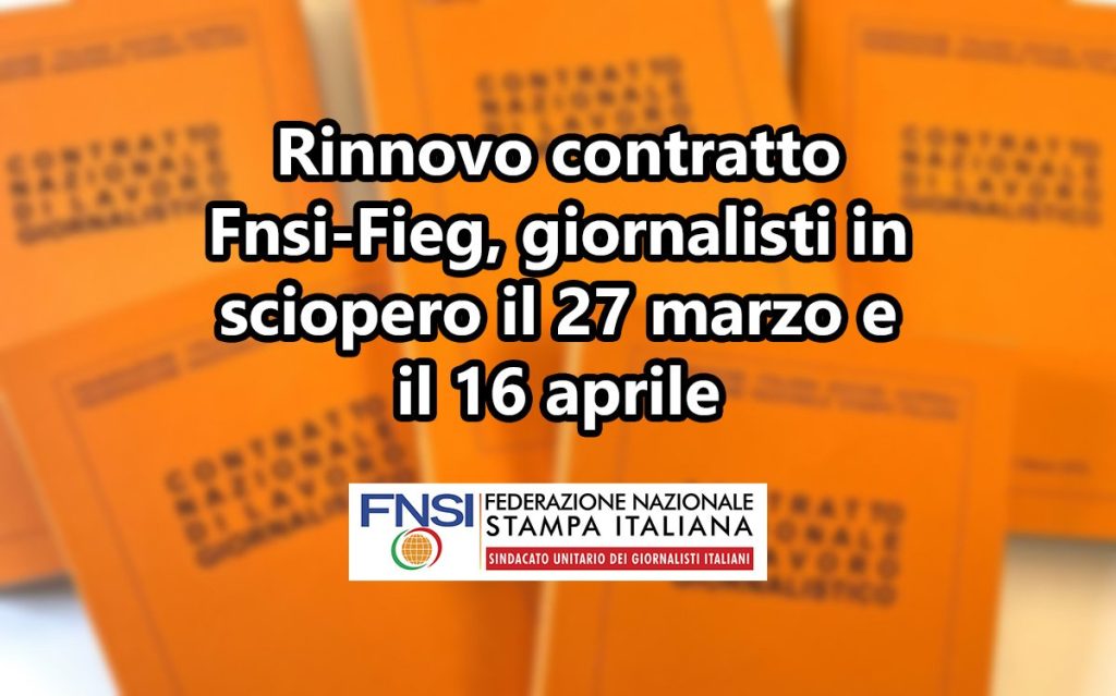 Nell’ambito della vertenza per il rinnovo contrattuale, che si protrae ormai da due anni, la Federazione nazionale della Stampa italiana ha proclamato altre due giornate di sciopero unitario: venerdì 27 marzo e giovedì 16 aprile 2026 (questa seconda data potrebbe subire spostamenti per consentire a tutti i colleghi, anche quelli della Rai, di aderire alla protesta).