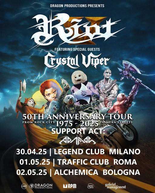 I Riot V tornano in Italia per le celebrazioni del cinquantesimo anniversario, le leggende statunitensi dell’heavy metal RIOT V aka RIOT, celebreranno il cinquantesimo anniversario della band, con una serie di spettacoli dal vivo esclusivi in Germania, Svizzera, Italia, Slovenia, Austria, Svezia e Danimarca.