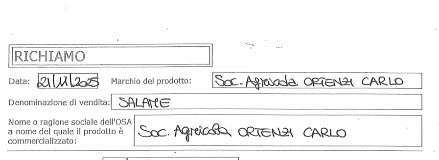 Il Ministero della Salute ha segnalato il richiamo precauzionale da parte del produttore di un lotto di salame della Società Agricola Ortenzi Carlo. Il motivo indicato sull’avviso di richiamo è la presenza di un rischio microbiologico non meglio specificato. Il prodotto in questione appartiene al lotto di produzione 08/09/25.