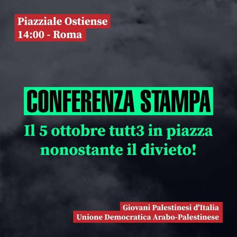Nel corso della conferenza stampa verranno illustrate le ragioni degli organizzatori. “Tutto il movimento italiano in queste settimane si è espresso compatto contro il divieto emanato dal Governo che continua a criminalizzare chi protesta al fianco della resistenza contro il Genocidio, lo stato di guerra imposto dal ddl 1660, l’imperialismo e il colonialismo. Il sacrificio del popolo palestinese e del popolo libanese ci impongono di scendere in piazza, consapevoli che la nostra resistenza e quella dei popoli oppressi potrà fermare l’occupante sionista e il sistema di guerra globale”, conclude la nota dei movimenti palestinesi che hanno promosso la manifestazione del 5 ottobre.