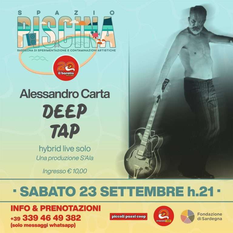 Dopo lo strepitoso successo all’esordio con “A cena con Mixed By Erry”, in attesa di “recuperare” post rinvio per maltempo l’appuntamento con “L’Uomo contro – vita arte e battaglie di G. M. Volontè”, sabato 23 settembre alle ore 21 lo “Spazio Piscina” si animerà dell’estro eclettico e impattante di Alessandro Carta e del suo hybrid live solo “DEEP TAP”. L’appuntamento è inserito all’interno della Rassegna di Sperimentazione e Contaminazioni Artistiche in collaborazione con Luigi Frassetto. Ingresso con ticket di 10 euro e possibilità di acquistare food & beverage all’interno dello spazio evento. Info e prenotazioni (solo messaggio whatsapp) al 3394649382.