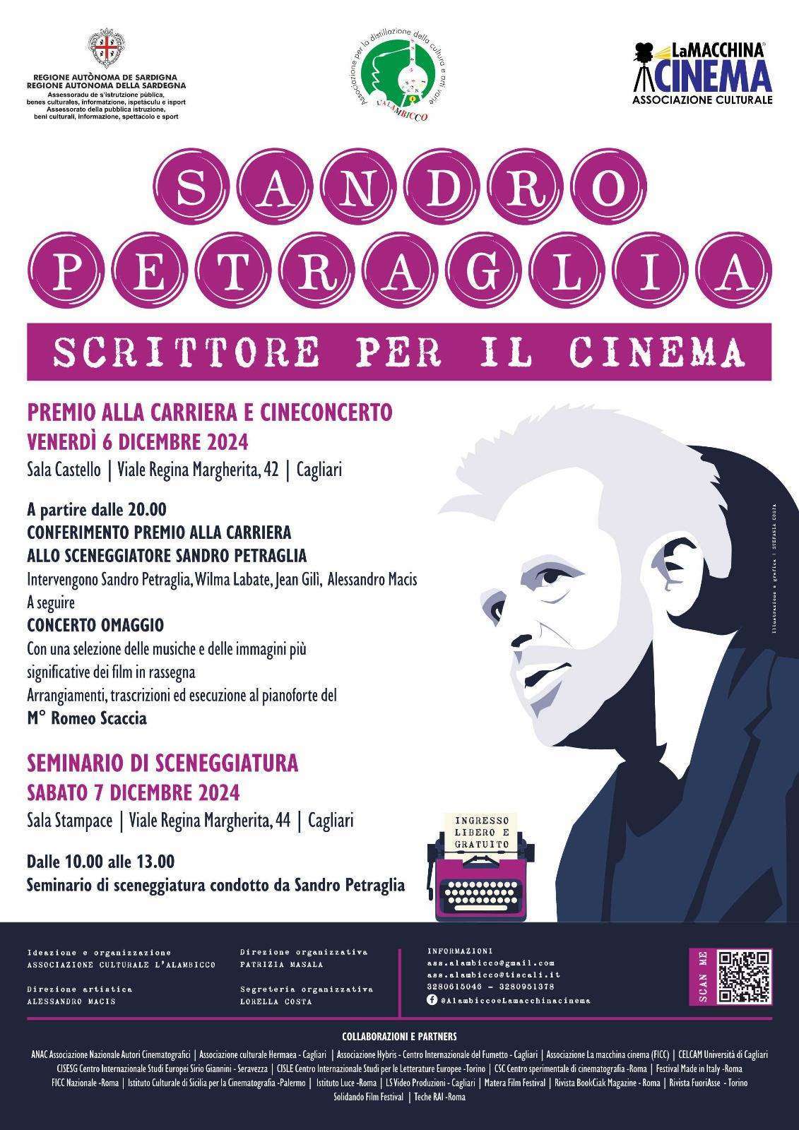 Sabato 7 dicembre, dalle 10 alle 13, il maestro terrà un seminario di sceneggiatura nella Sala Stampace (viale Regina Margherita 44). L’ingresso è libero e gratuito per tutti gli eventi. Per gli organizzatori è stato di fondamentale importanza offrire al pubblico appassionato di cinema, a scrittori e registi, a studenti delle scuole superiori e universitari, l’opportunità di confrontarsi con Petraglia in persona.