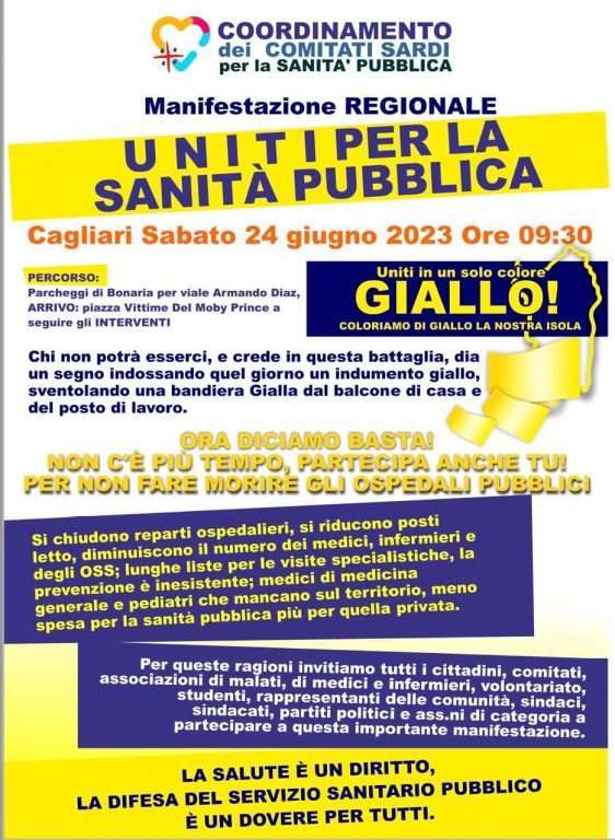 Il Coordinamento dei Comitati Sardi per la Sanità Pubblica ha promosso per sabato 24 giugno 2023 una manifestazione Regionale in difesa del servizio sanitario pubblico.
