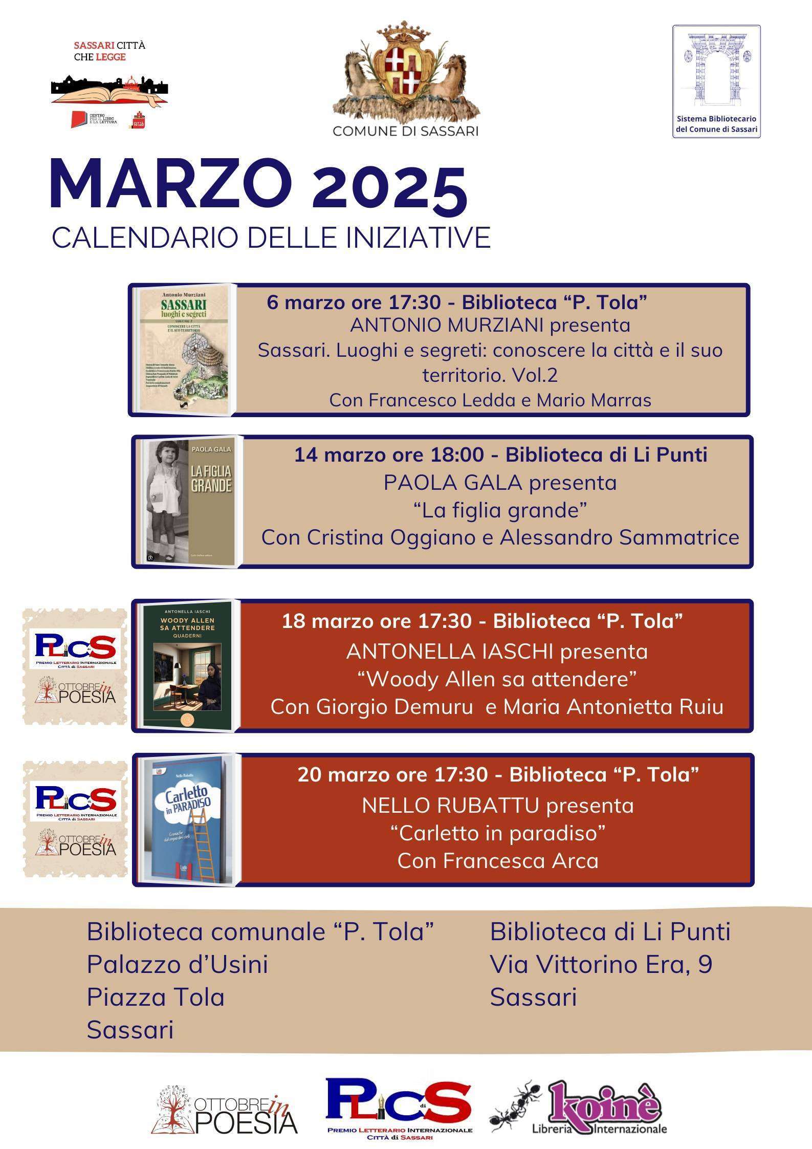 Si parte il 6 marzo con il secondo volume di “Sassari. Luoghi e segreti. Conoscere la città e il territorio” di Antonio Murziani. Un saggio che guida il lettore nell’osservazione e comprensione degli elementi storici e artistici che riguardano la città e il territorio di Sassari. Dialogano con l’autore Francesco Ledda e Mario Marras. Appuntamento per le 17:30 nella sala conferenze di Palazzo d’Usini in piazza Tola.