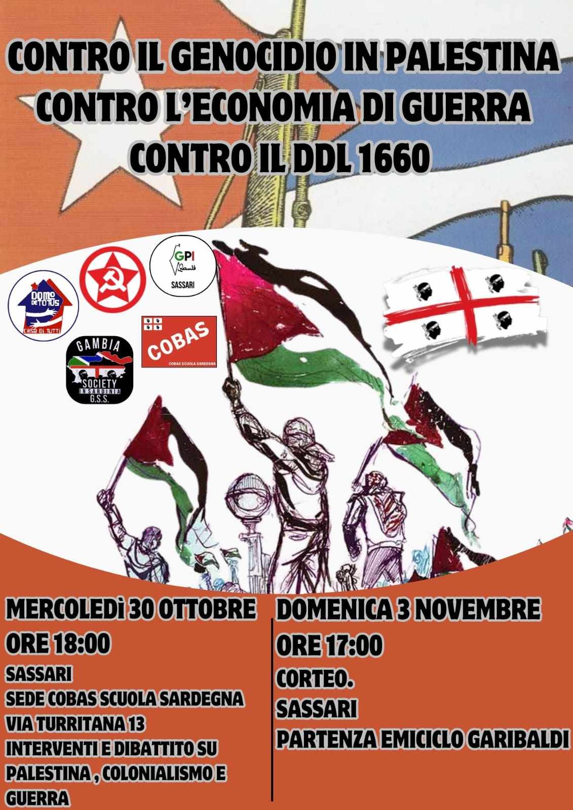 Il 30 ottobre e il 3 novembre si terranno due importanti appuntamenti di mobilitazione a Sassari, organizzati per denunciare il «genocidio» del popolo palestinese, la «pericolosa escalation bellica» conseguente all’economia di guerra e l’«attacco ai diritti democratici» con il DDL 1660.