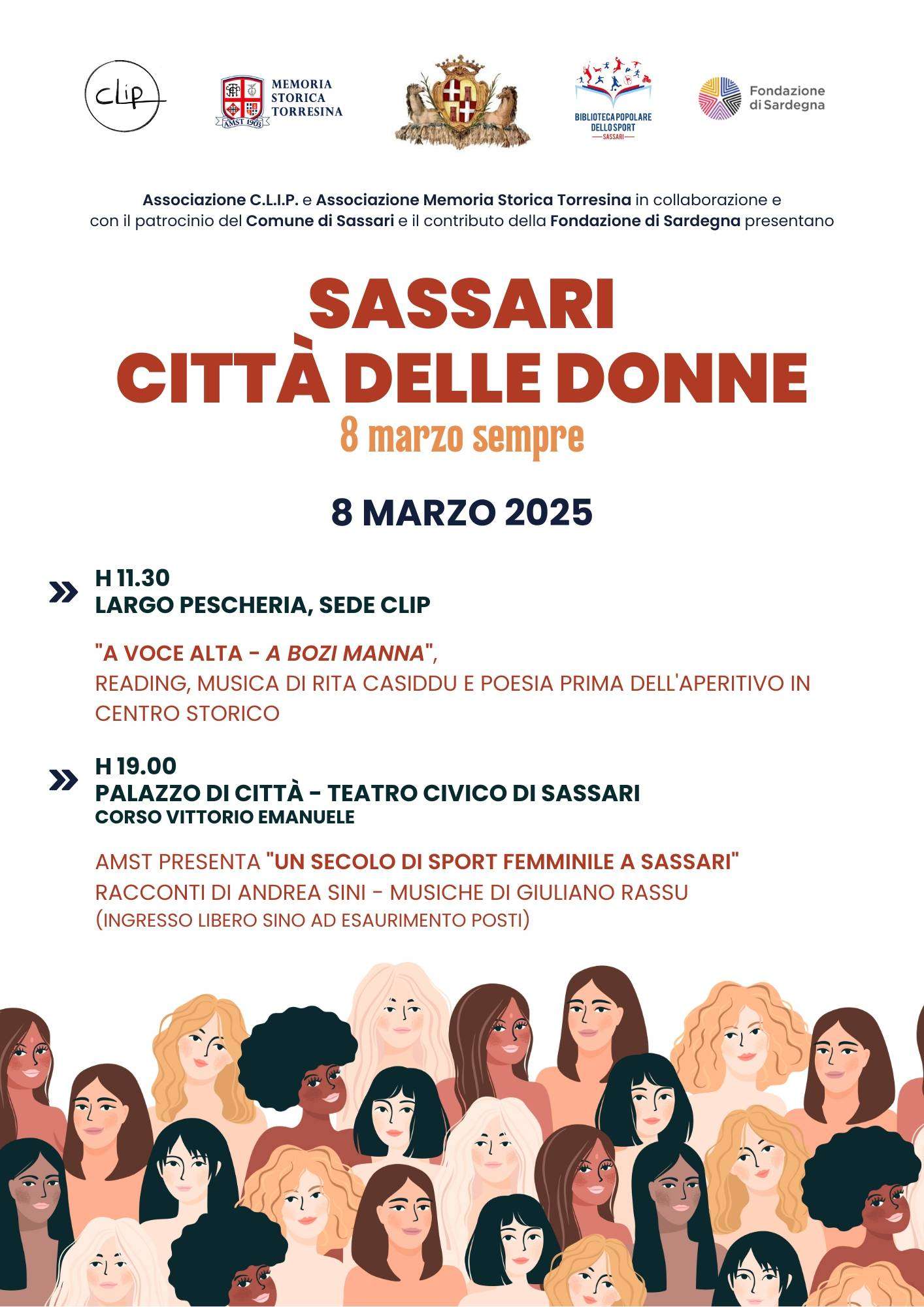 Una giornata di letture, canzoni, aperitivi, appuntamenti a teatro, racconti e immagini per fare dell’8 marzo un richiamo all’importanza di costruire una comunità che guardi al futuro dalla prospettiva femminile, immaginando una città più inclusiva, accogliente e solidale, in grado di coinvolgere, di estendere il perimetro della partecipazione, della cittadinanza attiva e della materializzazione dei diritti di tutte e di tutti. È l’idea che ispira Sassari città delle donne: 8 marzo sempre, manifestazione diffusa patrocinata dal Comune di Sassari grazie alla triangolazione tra il settore Politiche educative, il settore Politiche sociali e la commissione consiliare permanente per i problemi sociali, pubblica istruzione, attività culturali, sport, turismo e spettacolo.