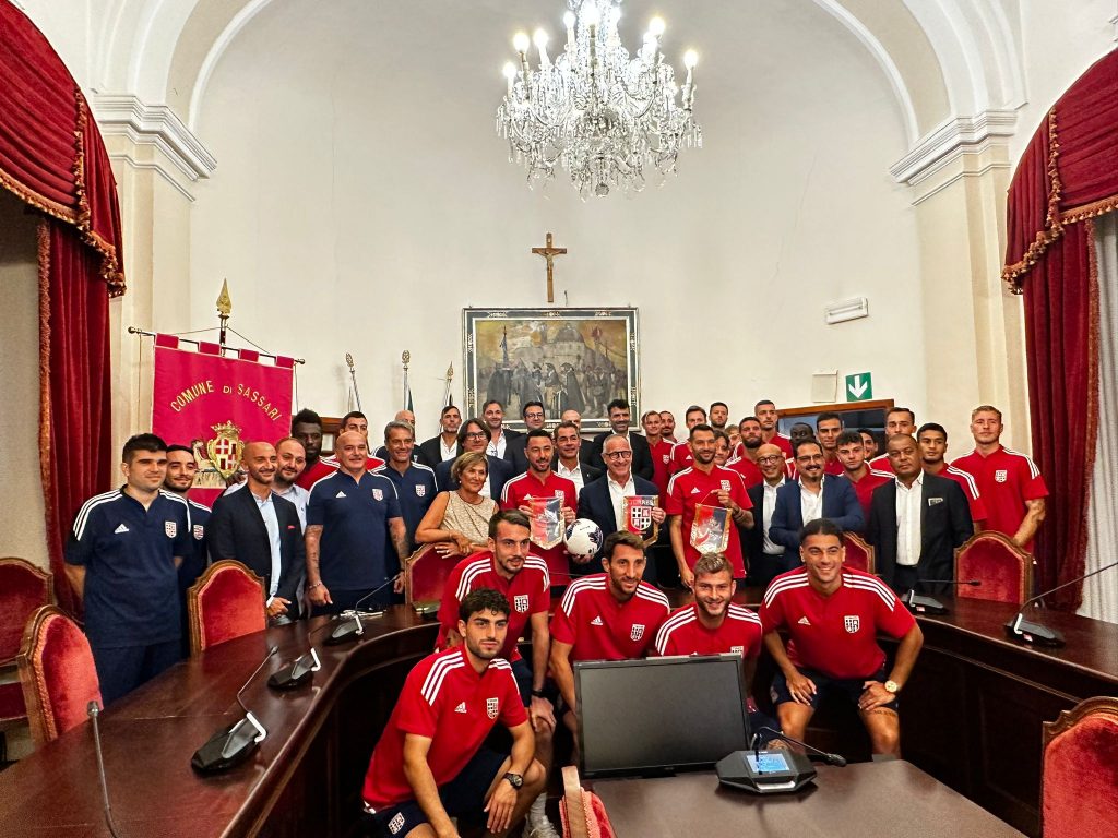 La prima squadra, lo staff tecnico e la dirigenza al gran completo capitanata dal presidente Stefano Udassi e dalla proprietà Abinsula (Pierluigi Pinna e Andrea Maddau) si radunano sotto palazzo Ducale. Ci sono tutti. Salgono le scale e fanno il loro ingresso nella sala del Consiglio comunale. Prendono posto sugli scranni, là dove si sviluppa la vita amministrativa della città. Arrivano poi i padroni di casa, il sindaco Nanni Campus, il presidente del Consiglio Comunale Maurilio Murru, l’assessora allo sport Rosanna Arru, l’assessore al Bilancio Carlo Sardara e l’assessore all’Urbanistica Nicola Lucchi. Lo scambio è vivace, si parla di calcio, di passione, di impegno e di sport. E dopo il promettente inizio a Recanati, si aspetta con fiducia l’esordio casalingo di sabato nella serie C 2023-2024 contro il Rimini.